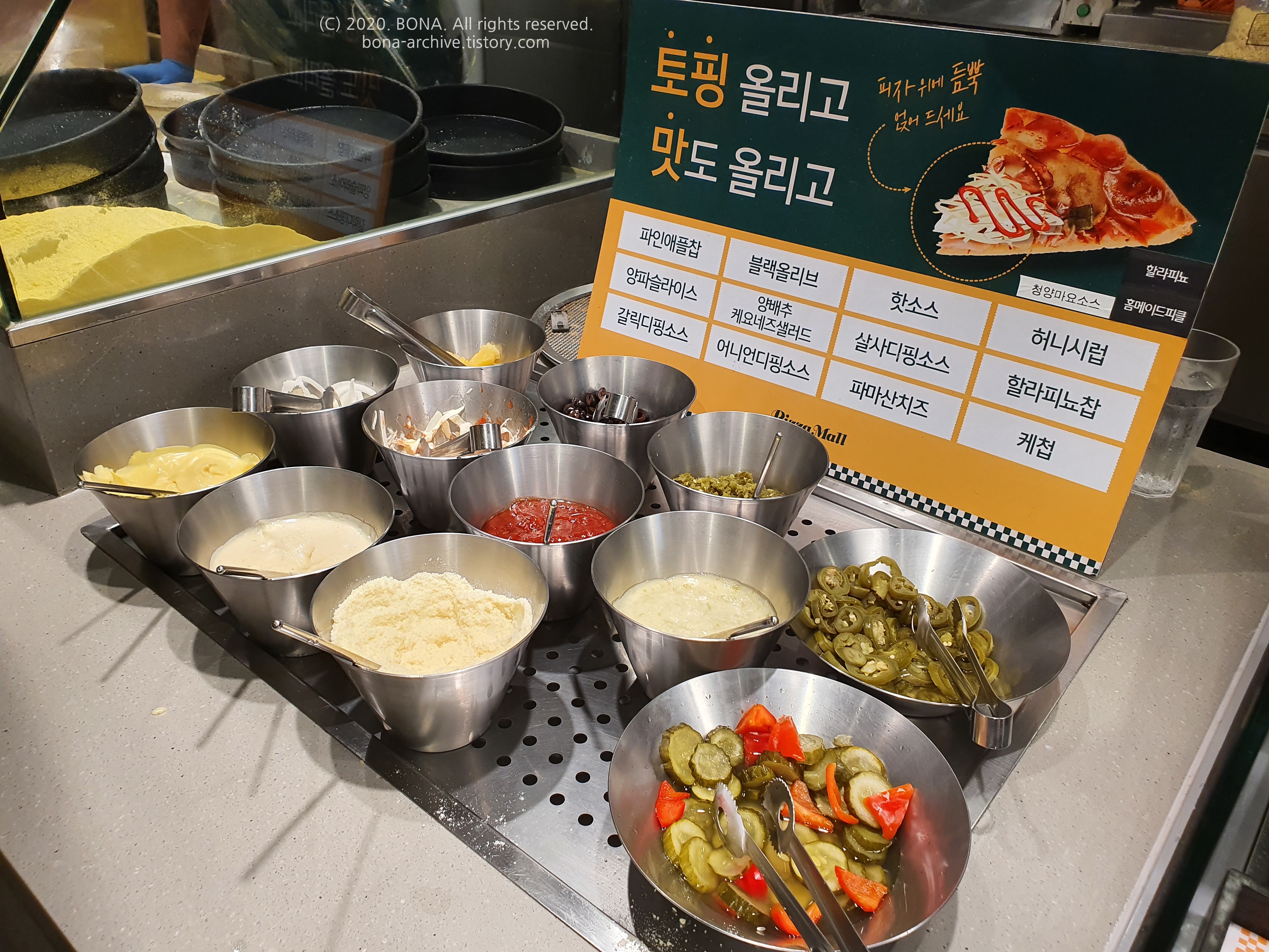 피자와 조합해서 먹을 수 있는 다양한 소스와 토핑들도 있었어요.