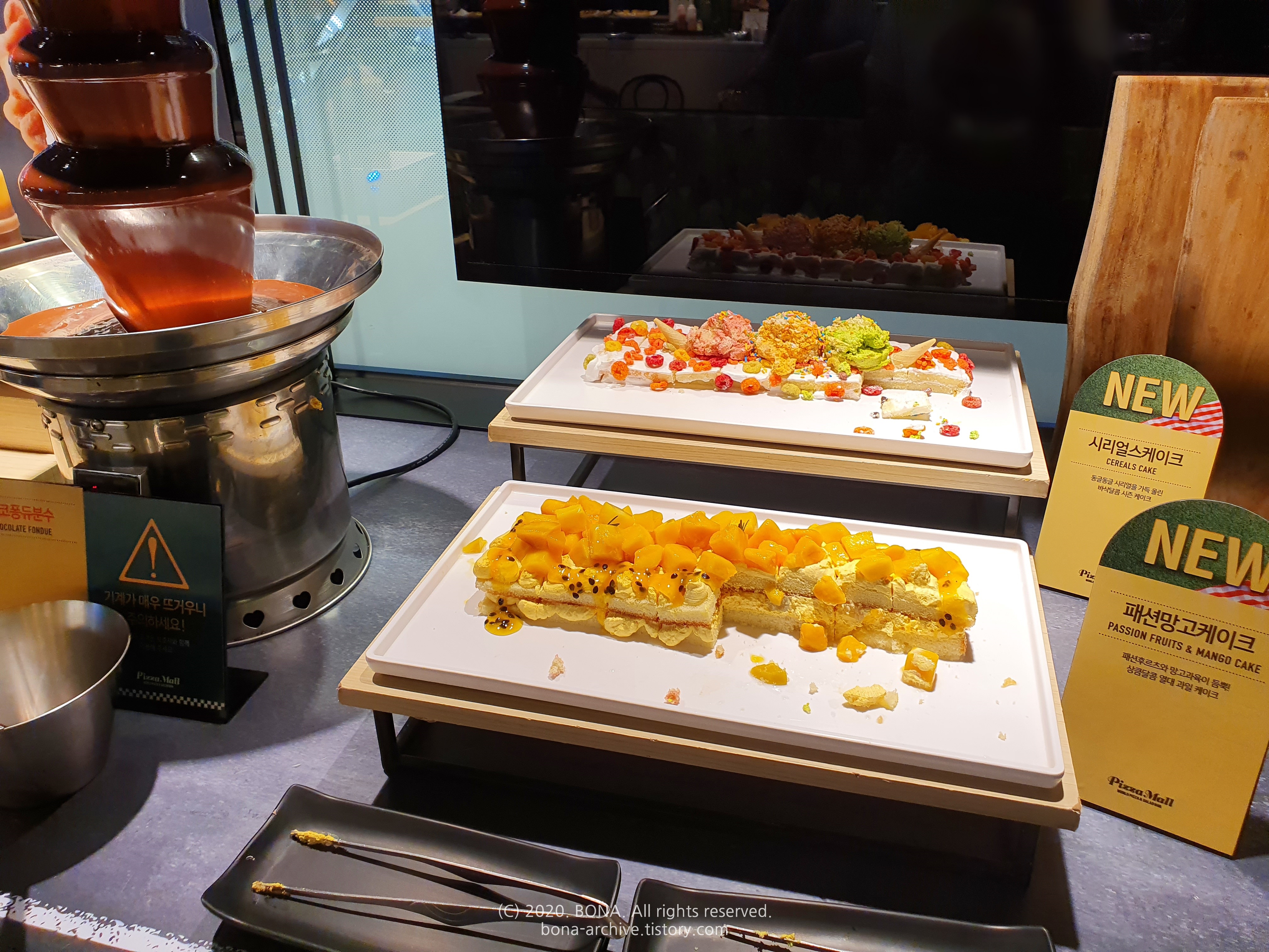 시리얼스케이크, 패션망고케이크, 초코퐁듀 분수도 있었어요.