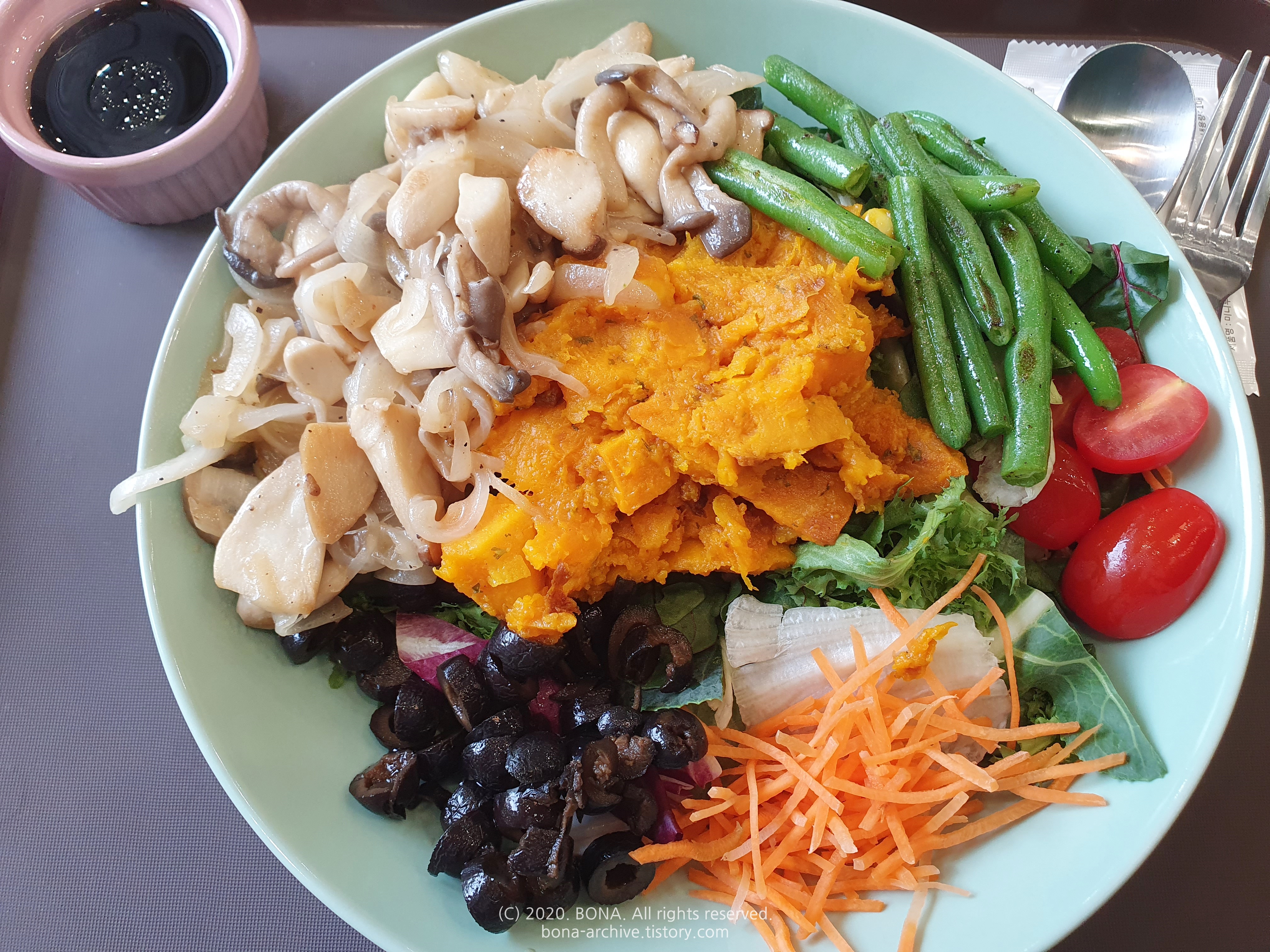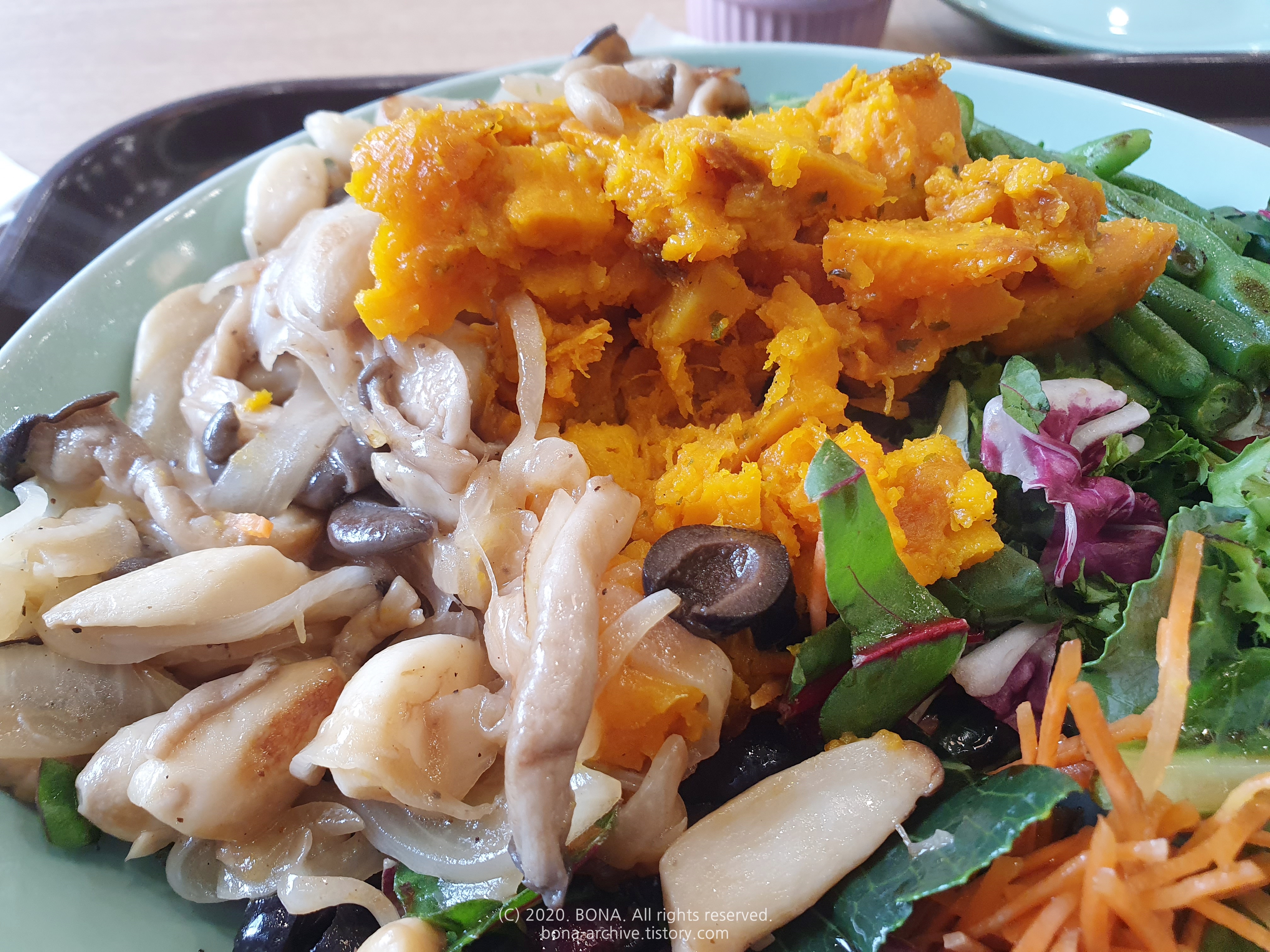 단호박은 으깨져있고, 버섯은 수분이 많은데 드레싱 뿌려서 채소들이랑 같이 먹으니 전체적으로 질척 질척...한 느낌이었습니다.