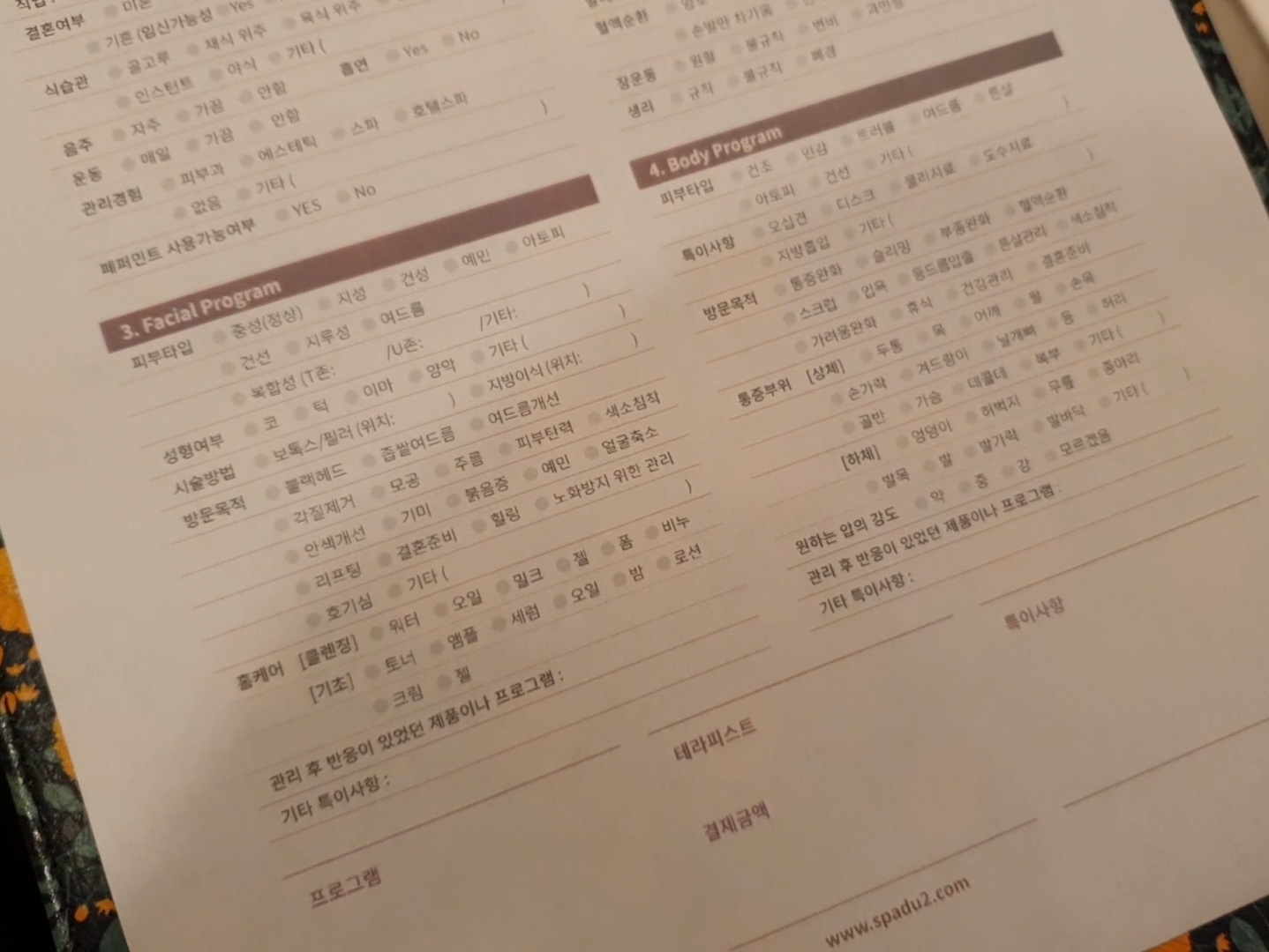 이렇게 설문지를 줘서 다시 한번 꼼꼼하게 사용될 화장품, 마사지 강도 등에 대한 내용을 공유합니다.