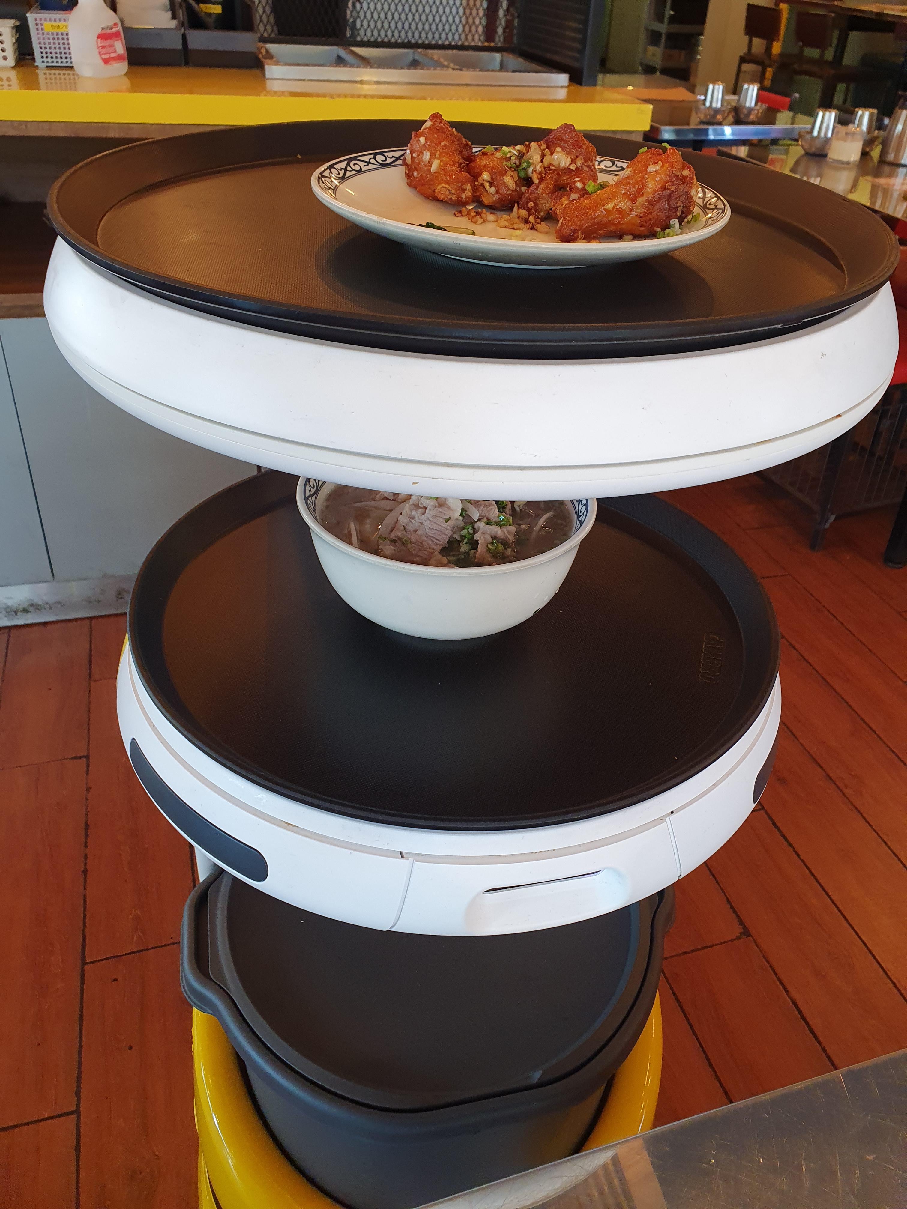 이번엔 로봇이 서빙해줬어요. 느억맘 닭날개 튀김과 차돌 쌀국수~