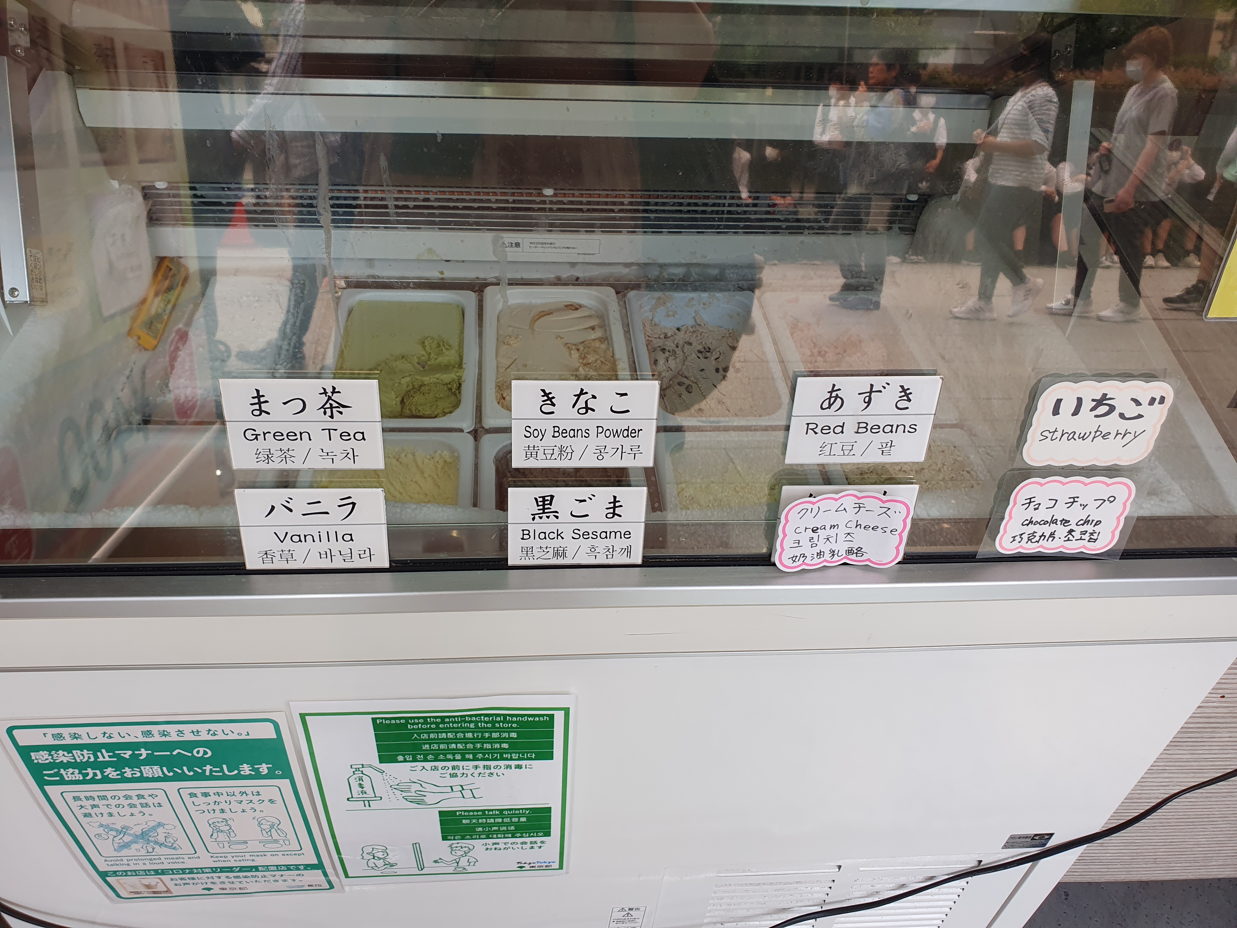 말차, 콩가루, 팥, 딸기, 바닐라, 흑참깨, 크림치즈, 초코칩 맛이 있습니다.