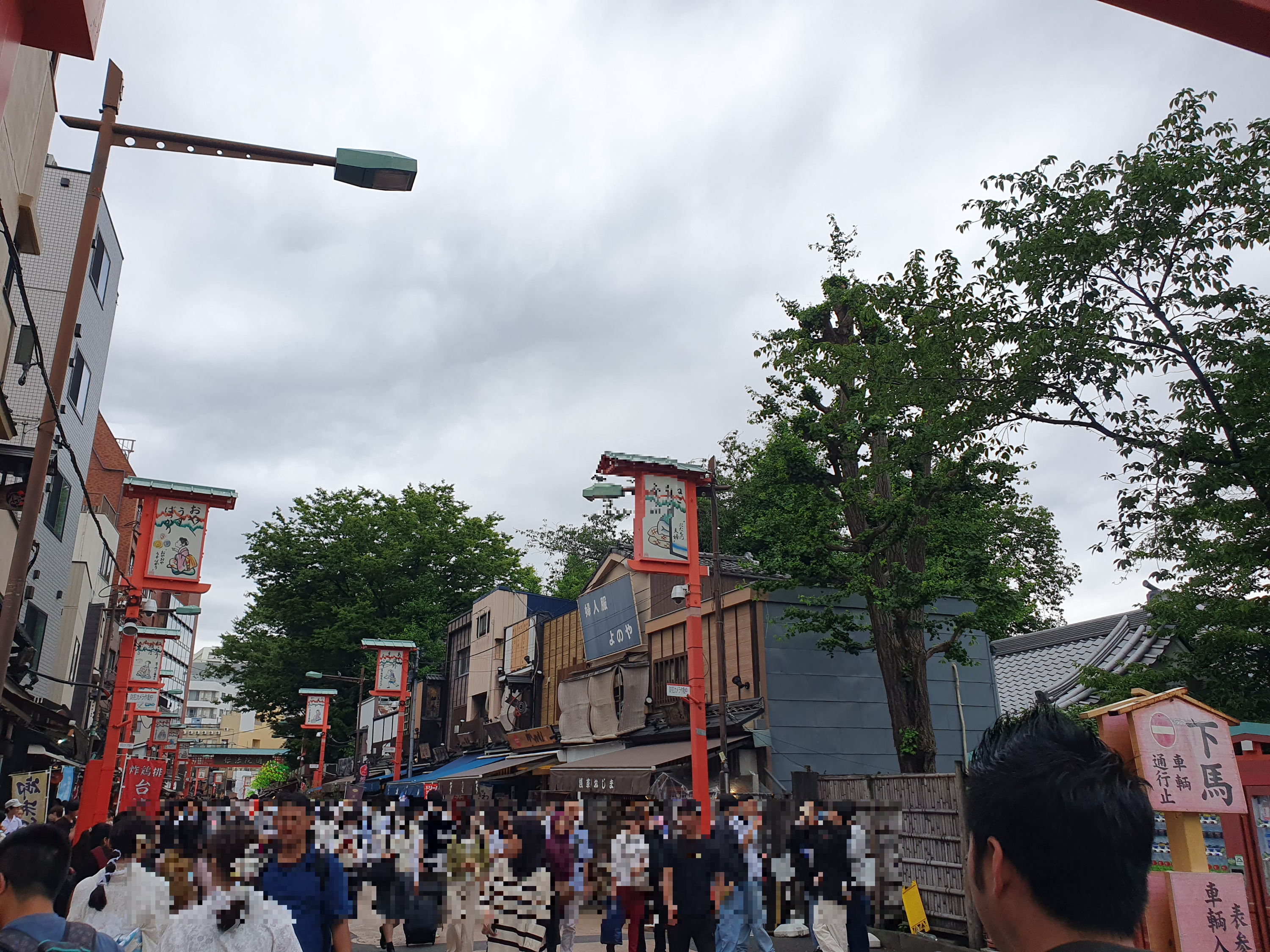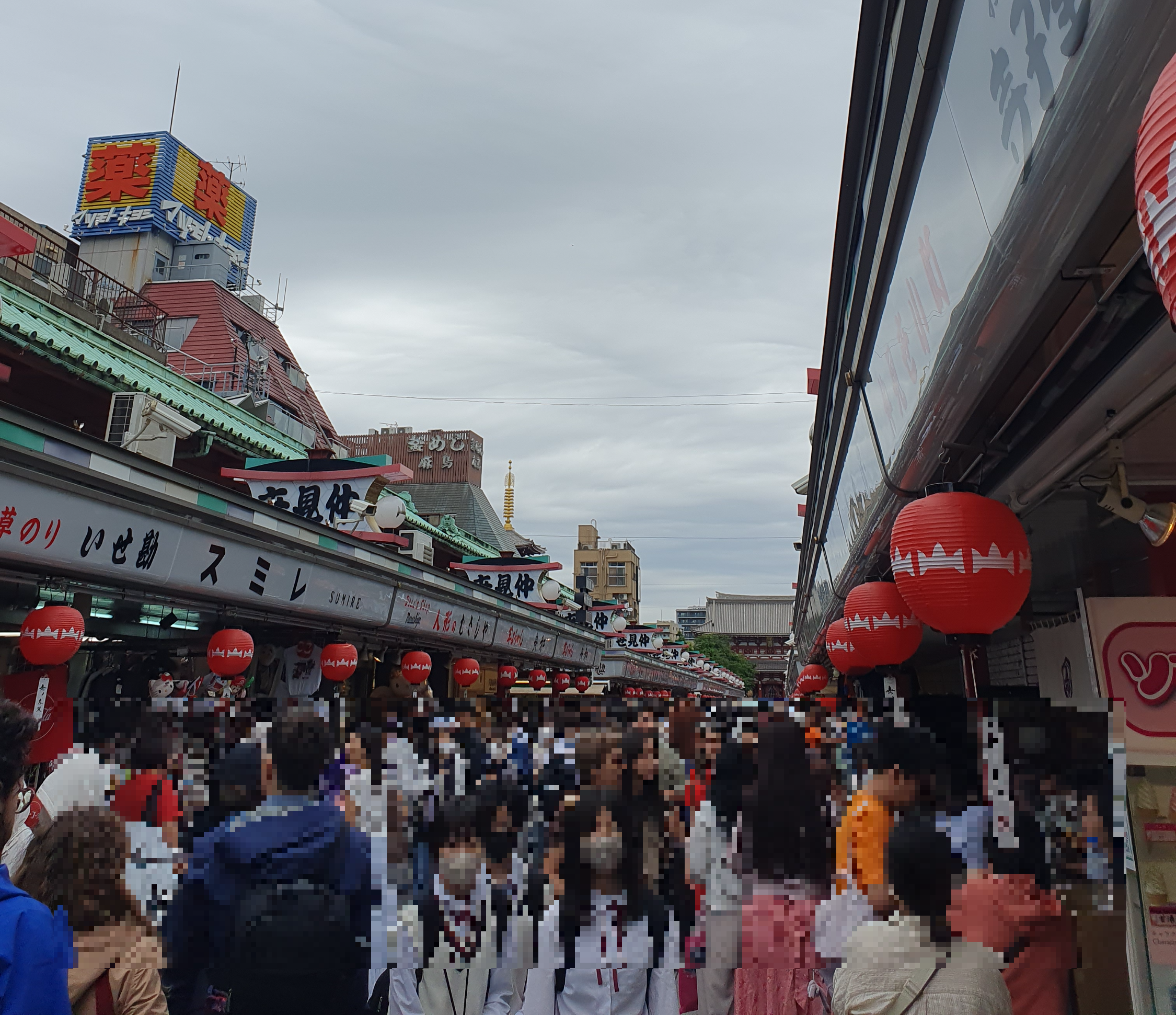 아사쿠사역에 내려서 3번 출구로 나와 쭉 걸으면 이렇게 센소지 입구가 보이고, 뒤로 쭉 나카미세도리가 이어집니다.